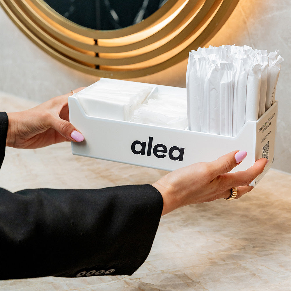 In our commitment to your well-being and our planet, we are thrilled to announce our partnership with Alea Protection, a Canadian sustainable period product company. Through this collaboration, we will provide organic and plastic-free sustainable tampons and pads for everyone in the office. These products will be conveniently available in the restrooms through Alea dispensers.